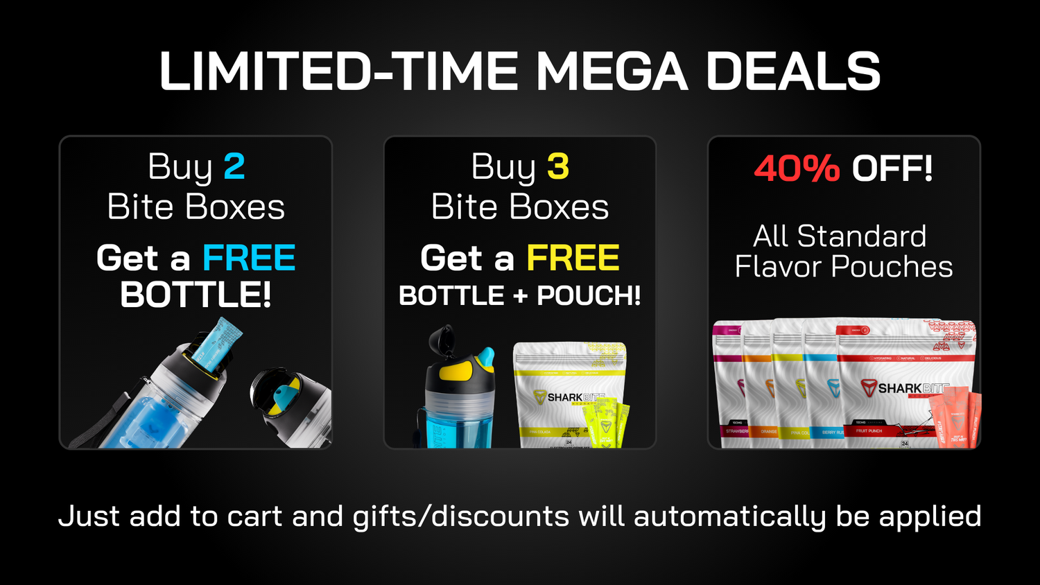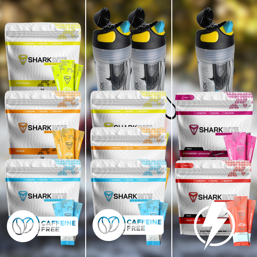 This all-in-one bundle includes our patent-pending SharkBite Hydration bottle and a 25-stick variety pouch featuring all five epic flavors:Berry Rush, Piña Colada, and Orange are caffeine-free and kid-safe, while Fruit Punch and Strawberry Lemonade each pack 100mg of natural caffeine...
