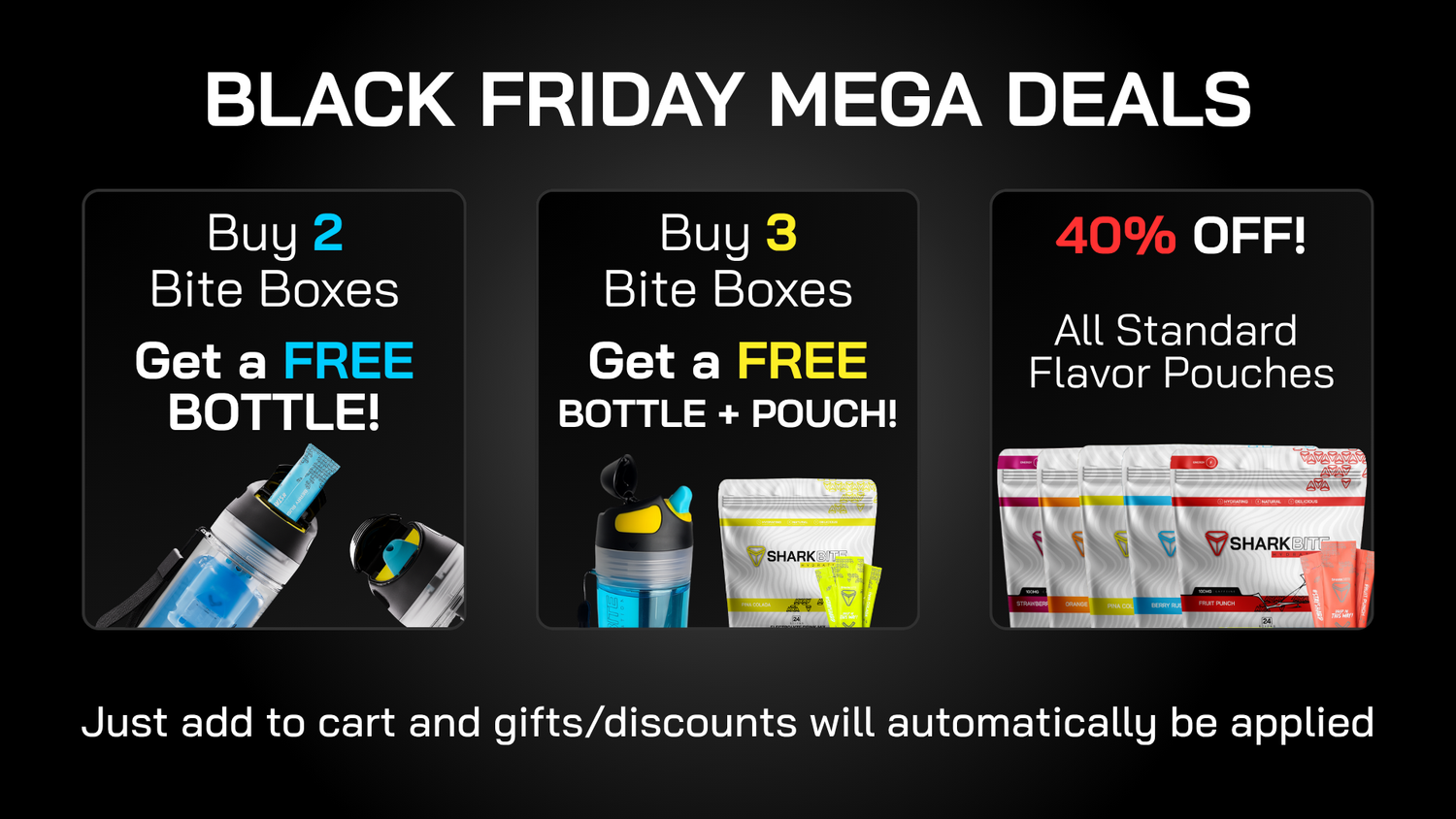 This all-in-one bundle includes our patent-pending SharkBite Hydration bottle and a 25-stick variety pouch featuring all five epic flavors:Berry Rush, Piña Colada, and Orange are caffeine-free and kid-safe, while Fruit Punch and Strawberry Lemonade each pack 100mg of natural caffeine...